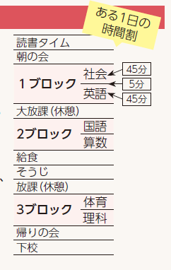 ブロックとは、45分授業2つとその間の5分休憩の合計95分間のこと。午前に2つ、午後に1つの合計3ブロック制で1日を構成しています。・なぜ3ブロック制にしたの?
