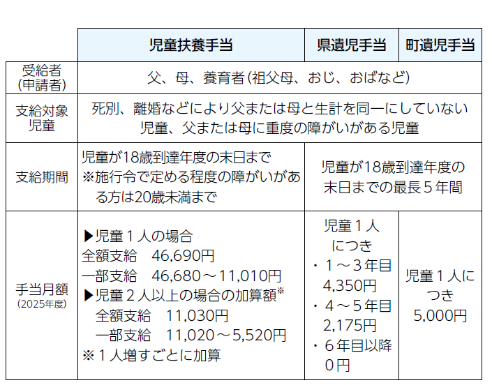 手当は、国の児童扶養手当、県遺児手当、町遺児手当で、すべて所得制限があります。手当の概要や支給要件、所得制限は問い合わせ先へ