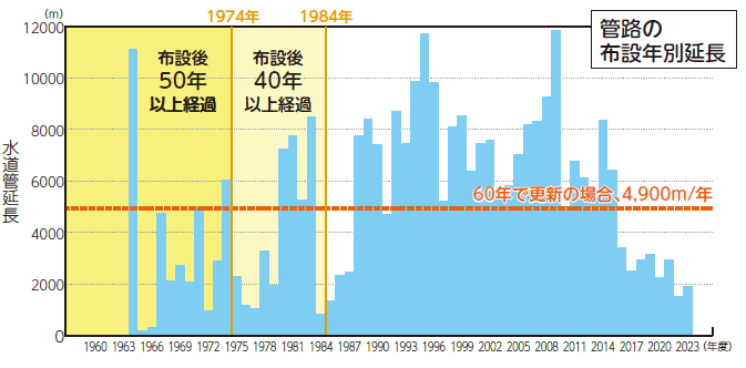 水道管の老朽化は全国的な問題となっており、漏水事故による大規模断水などが発生しています。町の水道管は1988年頃に整備が大きく進んだため、2028年度から設置後40年を超える管が大幅に増加します。設置後60年を超えないよう管路の更新を行っていますが、これには年間約4,900mの更新が必要です。