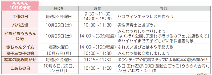 「ところ」が書かれていないものは、総合子育て支援センター(うららん)で実施するよ♪