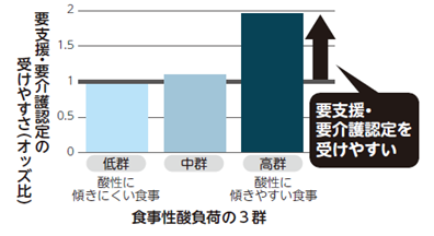 食事性酸負荷の度合いで低群・中群・高群に分けて、調査1年後の要支援・要介護認定率を比較すると、高群(酸性に傾きやすい食事をしていた群)は、低群(酸性に傾きにくい食事をしていた群)に比べて、新たに要支援・要介護認定を受ける方が多いことが判明しました。これまでの報告でも、酸性に傾きやすい食事をしていると、筋肉量が減少しやすくなるという海外の研究結果がいくつかあります。