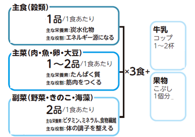 できるだけ毎食、主食・主菜・副菜がそろう食事を意識して、さらにコップ1~2杯/日の牛乳と、こぶし1個分/日の果物を目安とした食事をこころがけましょう。