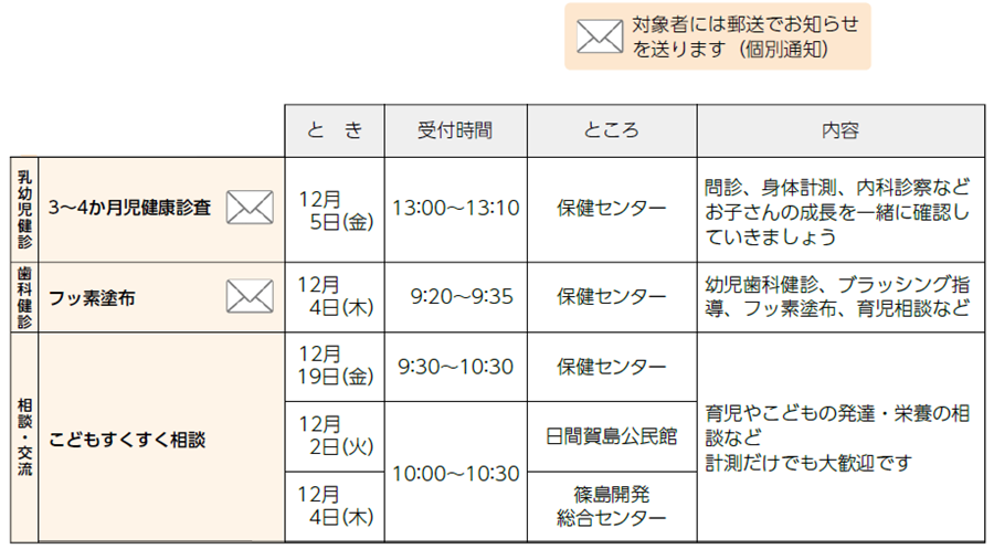 子育て 保健センターだより 12月の予定 29/47 前の記事 次の記事 発行日 : 2025年12月01日 自治体名 : 愛知県南知多町 広報紙名 : 広報みなみちた 2025年12月1日号 No.1083 翌月15日までの日程を掲載しています 乳幼児健診・歯科健診・相談・交流の際は必ず母子健康手帳をお持ちください 問合せ:保健センター 【電話】65-0711(内線511~514) Tweet シェアする 令和6年能登半島地震災害義援金(9月受付分) 12月の休日急病当番医