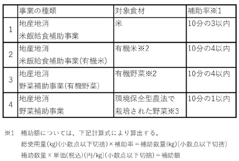 町内の小学校、中学校および保育所等の給食において、地元産の安心安全な農産物の供給および安定的な農業経営への展開を支援することで、地産地消の推進を図ることを目的に、学校等の給食に地場農産物を供給する者に対し交付する補助金です。