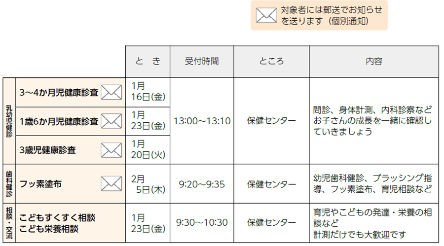 子育て 保健センターだより 23/43 前の記事 次の記事 発行日 : 2026年01月01日 自治体名 : 愛知県南知多町 広報紙名 : 広報みなみちた 2026年1月1日号 No.1084 翌月15日までの日程を掲載しています。 幼児健診・歯科健診・相談・交流の際は必ず母子健康手帳をお持ちください 問合せ:保健センター 【電話】65-0711(内線511~514) Tweet シェアする 町民会館図書室からのお知らせ 1月の休日急病当番医