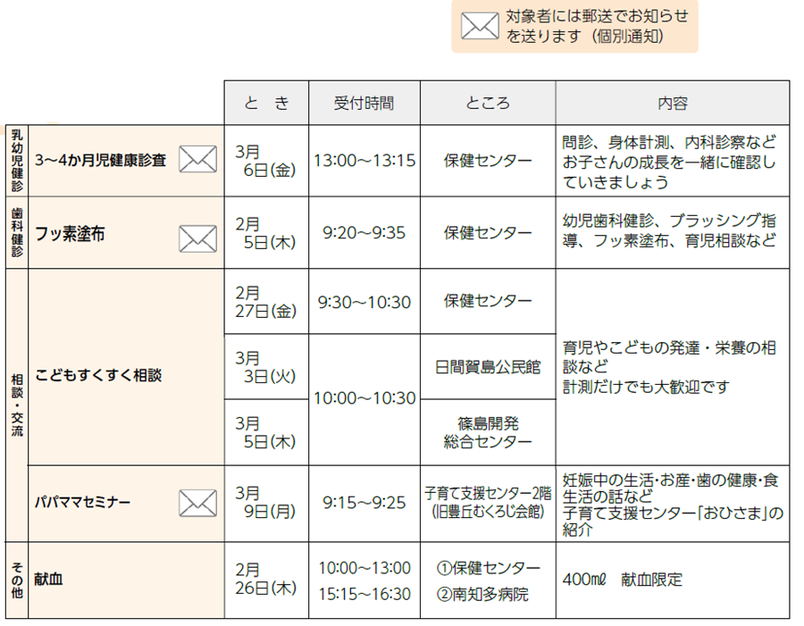 健康 保健センターだより 2月の予定 30/49 前の記事 次の記事 発行日 : 2026年02月01日 自治体名 : 愛知県南知多町 広報紙名 : 広報みなみちた 2026年2月1日号 No.1085 翌月15日までの日程を掲載しています 乳幼児健診・歯科健診・相談・交流の際は必ず母子健康手帳をお持ちください 問合せ:保健センター 【電話】65-0711(内線511~514) Tweet シェアする けんこう南知多プランワーキンググループ推進員会議を開催しました 2月の休日急病当番医