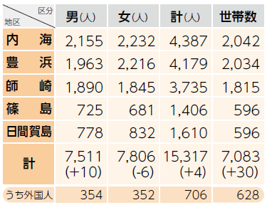 その他 人口と世帯数(住民基本台帳) 37/42 前の記事 次の記事 発行日 : 2025年11月01日 自治体名 : 愛知県南知多町 広報紙名 : 広報みなみちた 2025年11月1日号 No.1082 ( )内は前月比 令和7年9月末現在 ◆9月中の異動 出生 6人 死亡 32人 転入 149人 転出 118人 その他増減 -1人 Tweet シェアする 男女共同参画アンケート 町内の火災・救急・交通事故 9月