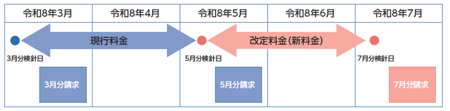 令和8年5月1日付で改定し、新料金表による水道料金が適用されるのは令和8年7月検針分からになります。