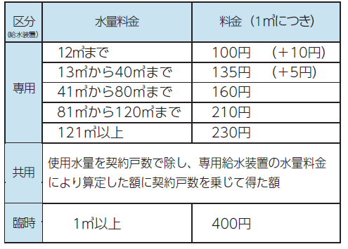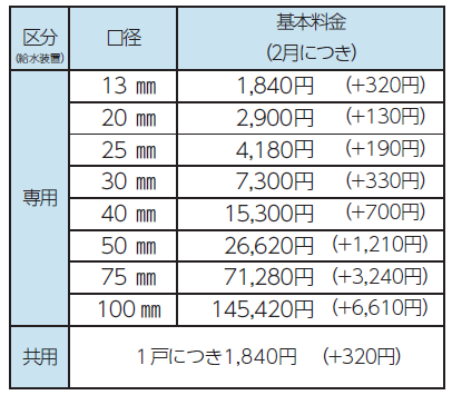下記の表の基本料金と水量料金の合計に100分の110を乗じて得た額。※()内は現在の料金との差額