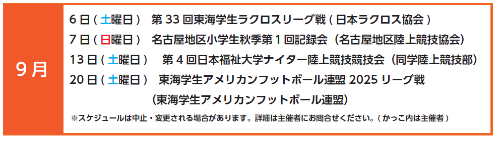 スポーツ 陸上競技場で開催される主な大会・イベントのスケジュール 8/41 前の記事 次の記事 発行日 : 2025年09月01日 自治体名 : 愛知県美浜町 広報紙名 : 広報みはま 令和7年9月号 No.999 陸上競技場の施設内容・利用案内は運動公園HPをご覧ください ・運動公園HP ・推進室Instagram ※二次元コードは本紙をご覧ください。 問合せ:生涯学習課 【電話】87-33009 Tweet シェアする 自宅でできる自重トレーニングで筋力UP Chab letter(チャブレター) vol.89