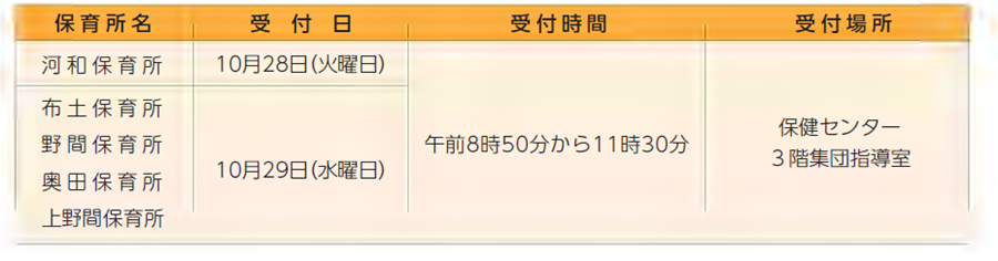 ※乳児の申込みについて、申込日に都合の悪い方は、後日役場健康・子育て課で受付します。