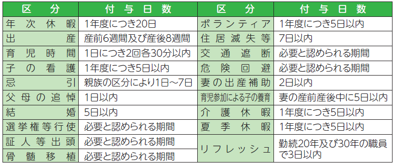 (2)休暇の種類(令和7年4月1日現在)