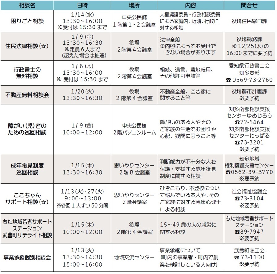 くらし 1月 無料相談 26/47 前の記事 次の記事 発行日 : 2025年12月01日 自治体名 : 愛知県武豊町 広報紙名 : 広報たけとよ 2025年12月号 ・(☆)は町内在住、在勤、在学の人に限る ・秘密厳守ですので、お気軽にご利用ください Tweet シェアする 朗読CDをご利用ください 子育て情報