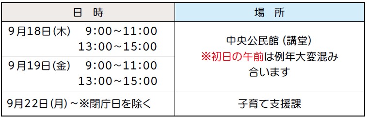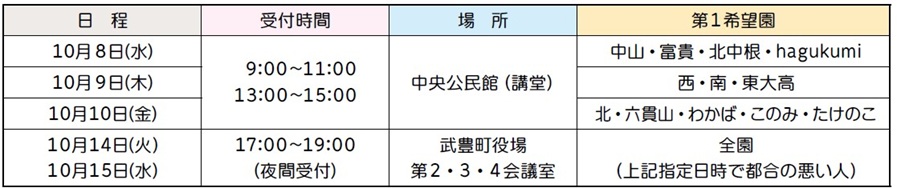その他で入所相談を希望される人は以下の日程でご来場ください。会場では、個別にお話を伺い、書類をご用意します。