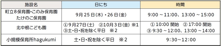 町立8保育園・このみ保育園・たけのこ保育園・北中根こども園(保育園部)・hagukumi