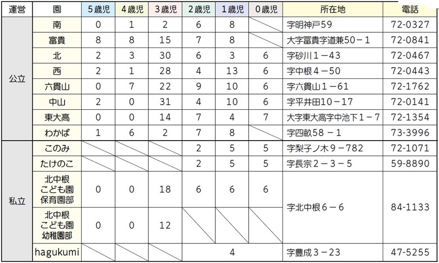 町立保育園…南・富貴・北・西・六貫山・中山・東大高・わかば