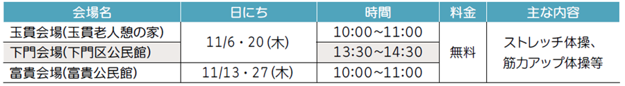対象:65歳以上で会場に自分で来られる人、医師から運動制限をされていない人