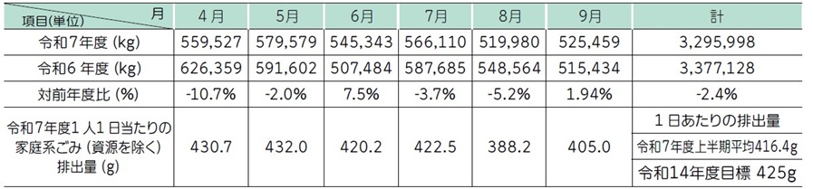 令和7年度上半期のご家庭からのごみ排出量の推移を報告いたします。