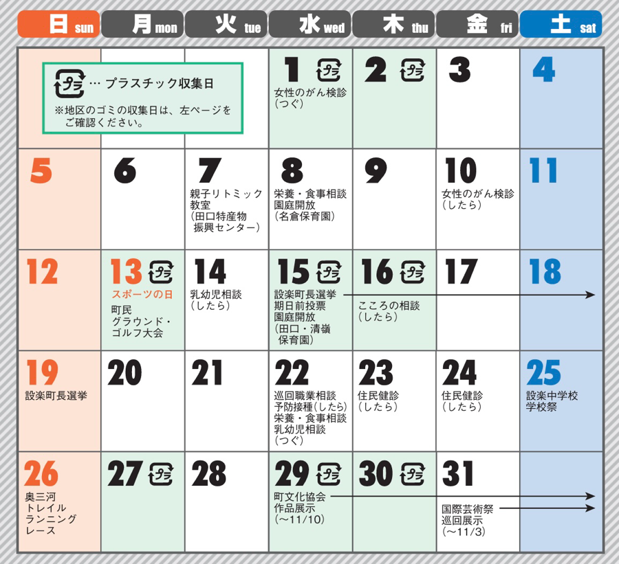 くらし 10月 町民カレンダー 21/31 前の記事 次の記事 発行日 : 2025年09月16日 自治体名 : 愛知県設楽町 広報紙名 : 広報したら 2025年10月号 ※新型コロナウイルスの影響で変更・中止になる可能性がありますので、各問い合わせ先か企画ダム対策課(電話62-0514)まで お問い合わせください。 Tweet シェアする 田口高校からこんにちは 役場の再生エネルギー発電量・リユースの広場