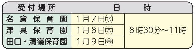 12月1日(月)から、申込書類を役場町民課または町内保育園で受け取り、必要事項を記入して、下記入所受付日に提出して面接を受けてください。これらの書類は入所決定の資料となりますので、必要事項の記入漏れなど無いようご注意ください。
