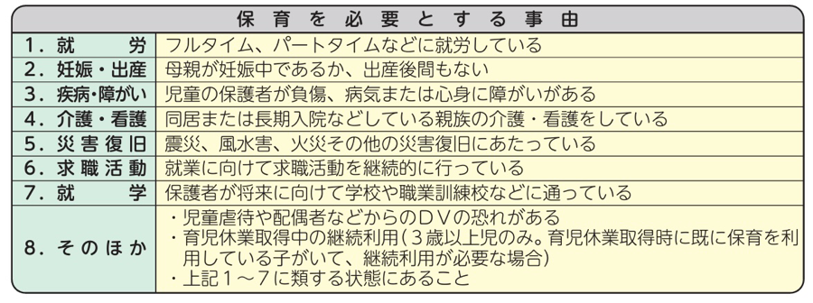 町内に住所(住民票)のある方で、児童の保護者(父、母)のいずれもが次の「保育を必要とする事由」のいずれかに該当し、家庭内で保育できない場合です。