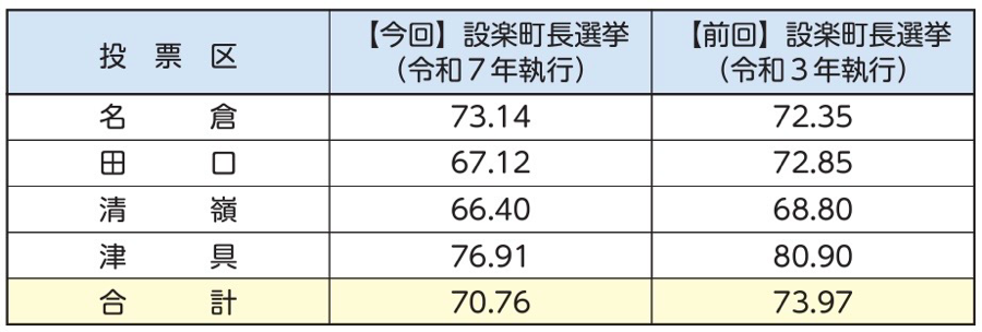 くらし 令和7年10月19日執行 設楽町長選挙投開票結果 3/26 前の記事 次の記事 発行日 : 2025年11月14日 自治体名 : 愛知県設楽町 広報紙名 : 広報したら 2025年12月号 設楽町長選挙の投開票結果については、以下のとおりとなりました。 ・開票結果 ・候補者別得票数 ・投票率(単位:%) Tweet シェアする 子ども・子育て支援金が充てられる事業のご案内 住民記録等システムの標準化に伴う各種証明書の様式変更について