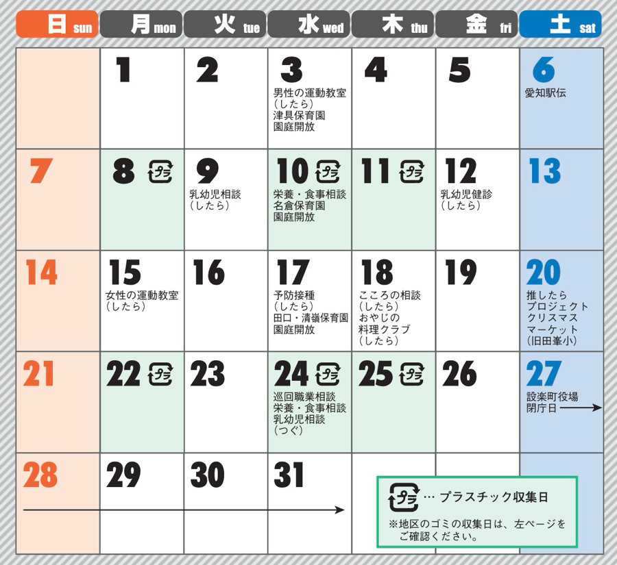 くらし 12月 町民カレンダー 17/26 前の記事 次の記事 発行日 : 2025年11月14日 自治体名 : 愛知県設楽町 広報紙名 : 広報したら 2025年12月号 ※新型コロナウイルスの影響で変更・中止になる可能性がありますので、各問い合わせ先か企画ダム対策課(【電話】62-0514)までお問い合わせください。 Tweet シェアする 田口高校からこんにちは 役場の再生エネルギー発電量・リユースの広場