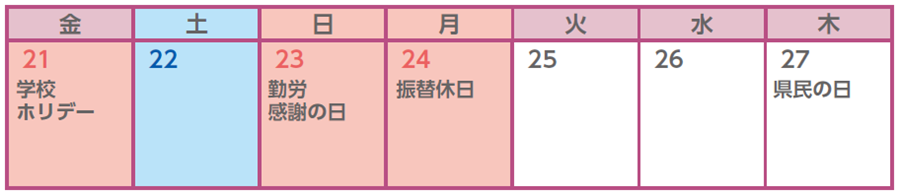 あいちウイークは、11月21日(金)から27日(木)で、東栄町の学校ホリデーは11月21日(金)です。
