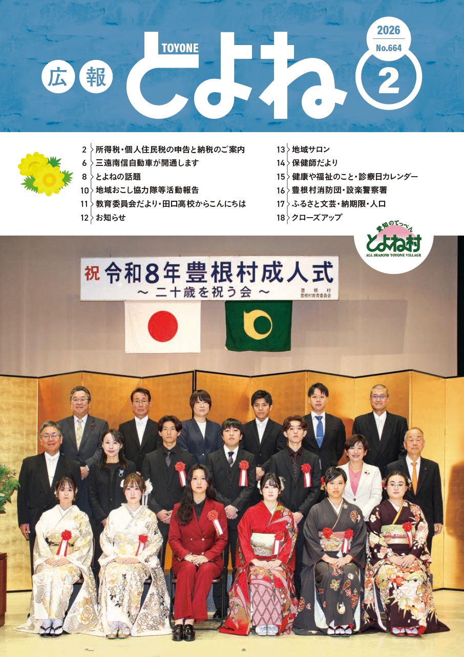 イベント 広報とよね 令和8年2月号 表紙 1/16 次の記事 発行日 : 2026年02月01日 自治体名 : 愛知県豊根村 広報紙名 : 広報とよね 令和8年2月号 Tweet シェアする 広報とよね 令和8年2月号 P.2