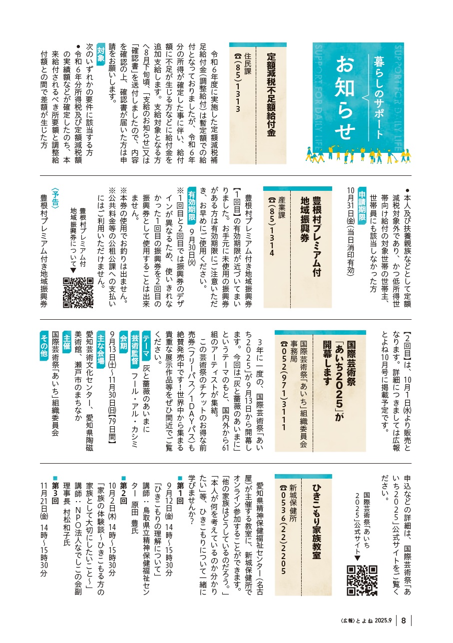 くらし 広報とよね 令和7年9月号 P.8 7/15 前の記事 次の記事 発行日 : 2025年09月01日 自治体名 : 愛知県豊根村 広報紙名 : 広報とよね 令和7年9月号 Tweet シェアする 広報とよね 令和7年9月号 P.7 広報とよね 令和7年9月号 P.9