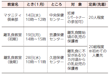 妊娠中の健康管理や子育てをサポートする教室を開催します。申し込み方法など、詳しくは市ホームページをご覧ください。