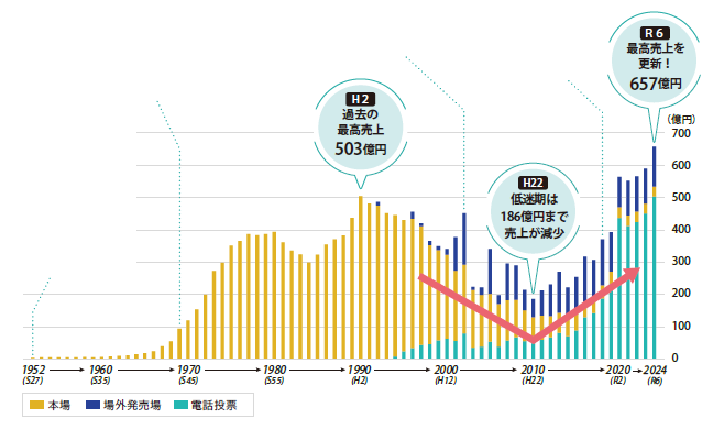 外向発売所や場外発売場の開設、スマートフォン普及の好機を生かした電話投票の促進など、再建を図る施策を積み重ね、令和6年度に最高売上を更新しました。