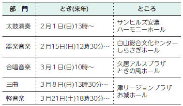 太鼓、器楽、合唱、三曲、軽音楽の各部門で出演団体を募集中です。出演料など詳しくは募集要項をご覧ください。