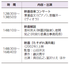 イベント 津の文化薫る催し物のご案内 23/27 前の記事 次の記事 発行日 : 2025年09月01日 自治体名 : 三重県津市 広報紙名 : 広報つ! 令和7年9月号 ●第11回彼岸花映画祭in津 映画監督小津安二郎ゆかりの地である津市で、映画祭を開催します。 今回は「家族」をテーマにした小津監督の流れをくむ、山田洋次監督の名作「たそがれ清兵衛」を上映します。 日時:9月27日(土)12時開場 場所:三重大学三翠ホール(栗真町屋町) 問合せ:文化振興課 【電話】229-3250【FAX】229-3344 Tweet シェアする 歴史散歩〔227〕 図書館へ行こう!