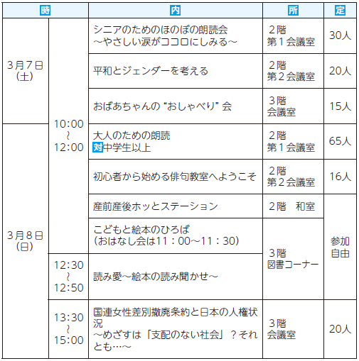 その他:託児有り(無料。6カ月~未就学児。先着8人。2月26日までに要申し込み)