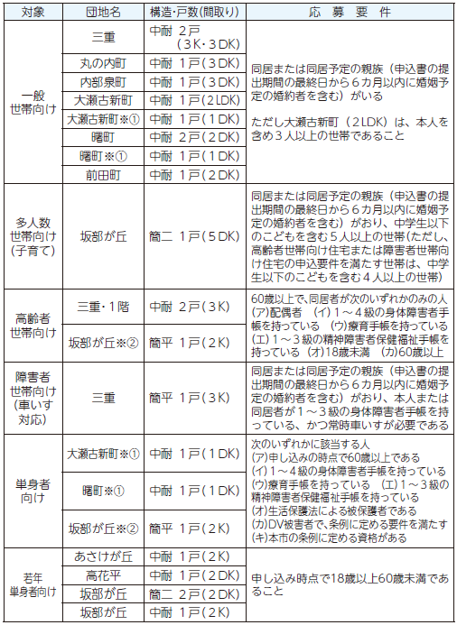 その他:公募要領、申込用紙は同課で入手可(各地区市民センターでは入手不可)。当選後は原則連帯保証人2人と、決定家賃の3カ月分の敷金が必要(連帯保証人は、1人減じるまたは免除することができる場合や、債務保証業者を利用できる場合あり)。募集戸数は、状況により変動する場合あり