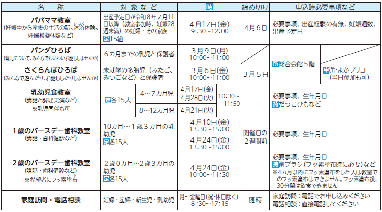 申し込み:ファックス・はがき・電話・窓口・よかプリコ(さくらんぼひろば、乳幼児食教室、1歳・2歳のバースデー歯科教室のみ)で、こども家庭センター(総合会館3階)へ