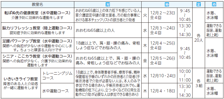 その他:主治医が運動不可と判断した場合は、参加不可。6~12月に、同じコースに複数回の申し込み不可(異なるコースには申し込み可)。令和8年1月以降は2回目の応募可(応募者多数の場合は初回の人を優先)。ただし、いきいきライフ教室は参加回数の制限なし