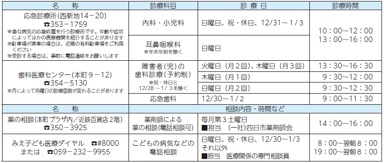 健康 【保健だより】休日救急医療など 48/53 前の記事 次の記事 記事を読み上げる 発行日 : 2025年10月20日 自治体名 : 三重県四日市市 広報紙名 : 広報よっかいち 10月下旬号No.1679 ※病気かな?と思ったら、まずはかかりつけ医に相談を Tweet シェアする 急な病気やけがのときに受診可能な医療機関を24時間案内 【保健だより】こども家庭センター