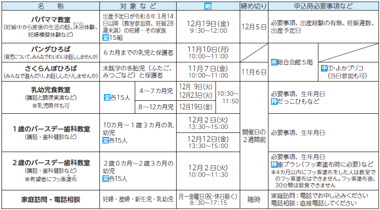 申込み:こども家庭センター(総合会館3階)、ファックス・はがき・電話・窓口・よかプリコ(さくらんぼひろば、乳幼児食教室、1歳・2歳のバースデー歯科教室のみ)