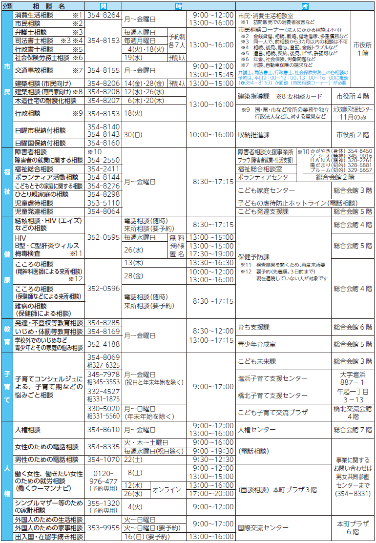 くらし 11月の予定 52/53 前の記事 次の記事 記事を読み上げる 発行日 : 2025年10月20日 自治体名 : 三重県四日市市 広報紙名 : 広報よっかいち 10月下旬号No.1679 ■相談 祝・休日を除く Tweet シェアする 三重北勢健康増進センター(ヘルスプラザ) その他のお知らせ(広報よっかいち 10月下旬号No.1679)