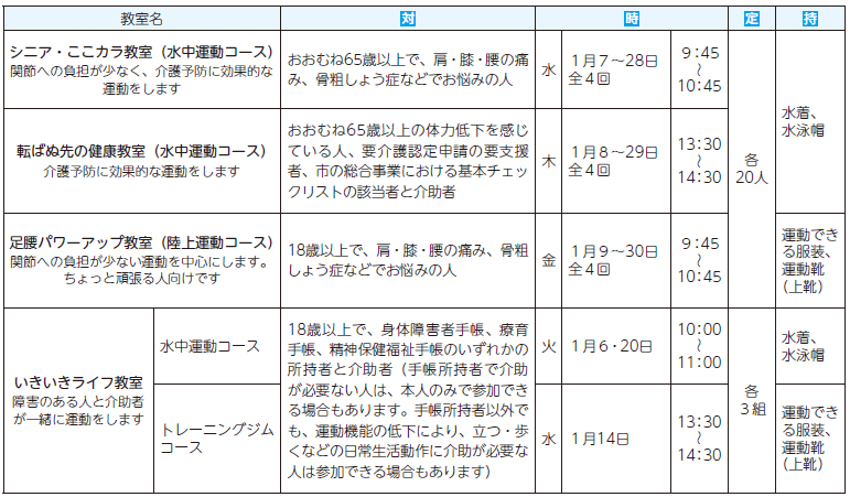 申し込み:12月20日(必着)までに、ファックス・はがき・電話で、必要事項、今までにかかった病気および治療中の病気・心臓病・不整脈・運動制限の有無(ある場合は、病名と発症した時期、主治医の許可の有無)、内服薬の有無(ある場合は、薬名)、関節の痛みの有無(ある場合は、部位)を、〒510-0851 塩浜町1-11 ヘルスプラザへ