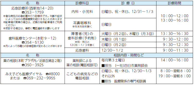 健康 【保健だより】休日救急医療など 48/53 前の記事 次の記事 記事を読み上げる 発行日 : 2025年11月20日 自治体名 : 三重県四日市市 広報紙名 : 広報よっかいち 11月下旬号No.1681 ※病気かな?と思ったら、まずはかかりつけ医に相談を Tweet シェアする 急な病気やけがのときに受診可能な医療機関を24時間案内 【保健だより】こども家庭センター