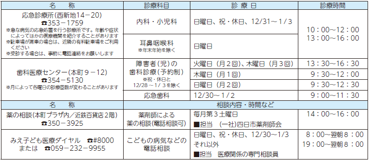 健康 【保健だより】休日救急医療など 46/56 前の記事 次の記事 記事を読み上げる 発行日 : 2025年12月20日 自治体名 : 三重県四日市市 広報紙名 : 広報よっかいち 12月下旬号No.1683 ※病気かな?と思ったら、まずはかかりつけ医に相談を Tweet シェアする 急な病気やけがのときに受診可能な医療機関を24時間案内 【保健だより】こども家庭センター