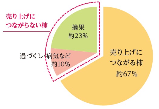 生産者への聞き取りなどから、柿の木1本当たりのおおよその生産量の割合を計算すると左の図のようになります。約3分の1は、摘果作業で果実が成長する前に摘み取ったり、成長をしても過づくし(熟れすぎてしまうもの)になったりし、売り上げにつながっていません。今後、このような柿をうまく活用することができれば、価値が0だったものから、新たな収益源を生み出すことができます。