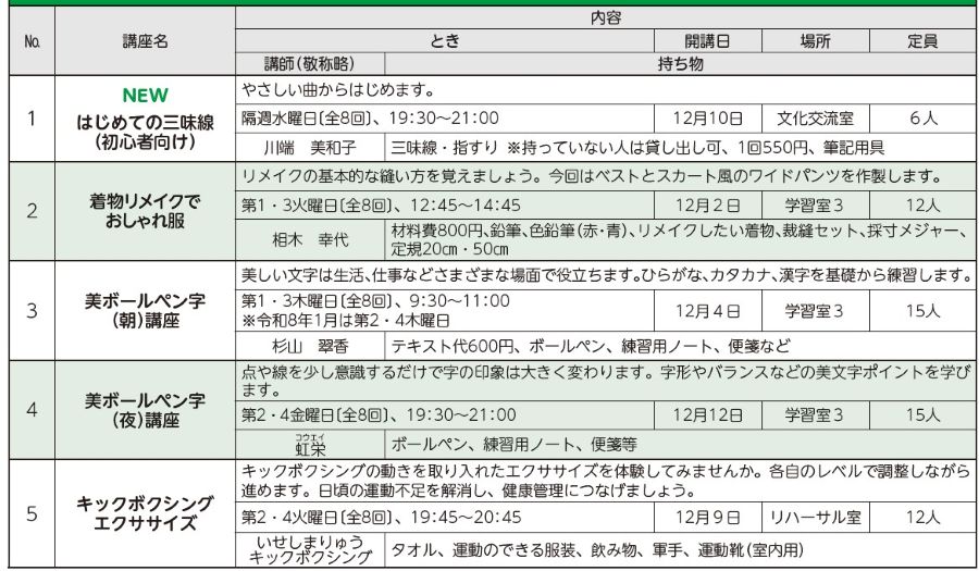 受講料:5回以上の講座は1,000円(別途材料費が必要な講座あり)