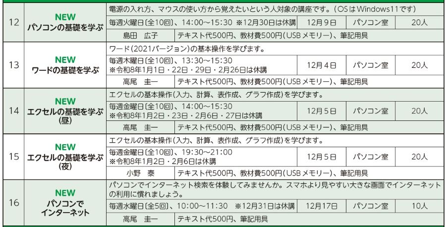 ※No12「パソコンの基礎を学ぶ」に申し込む場合、No13~No15「ワード・エクセル」には申し込めません。またこれらの「ワード・エクセル」の講座は、「パソコンの基礎」を受講したことがある人、またはパソコンの基礎ができる人に限ります。