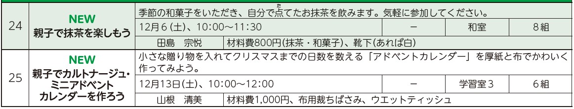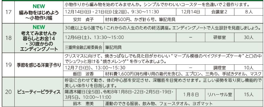 ※過去1年間に同一講座を受講(受講中にキャンセルした人を含む)した人は申し込みできません。(NEWが付いている講座は申し込み可)