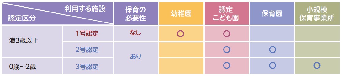 保育園、幼稚園、認定こども園、小規模保育事業所を利用するためには、「教育・保育給付認定」を受ける必要があります。認定は、子どもの年齢や保育の必要性に応じて1号~3号までの区分があり、認定区分により利用する施設が変わります。