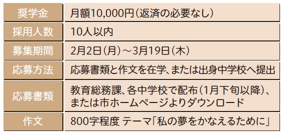 勉学の意欲がありながら、学資等の支援が必要と認められる生徒に対し、将来社会に貢献する有為な人材を育成することを目的に、奨学金の給付を行います。応募書類については市ホームページをご覧ください。